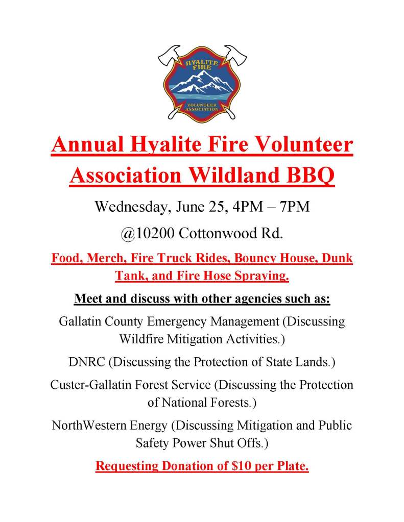 ANNUAL HYALITE FIRE VOLUNTEER ASSOCIATION WILDLAND BBQ: Share this: Click to share on X (Opens in new window) X Click to share on Facebook (Opens in new window) Facebook Like Loading... Related